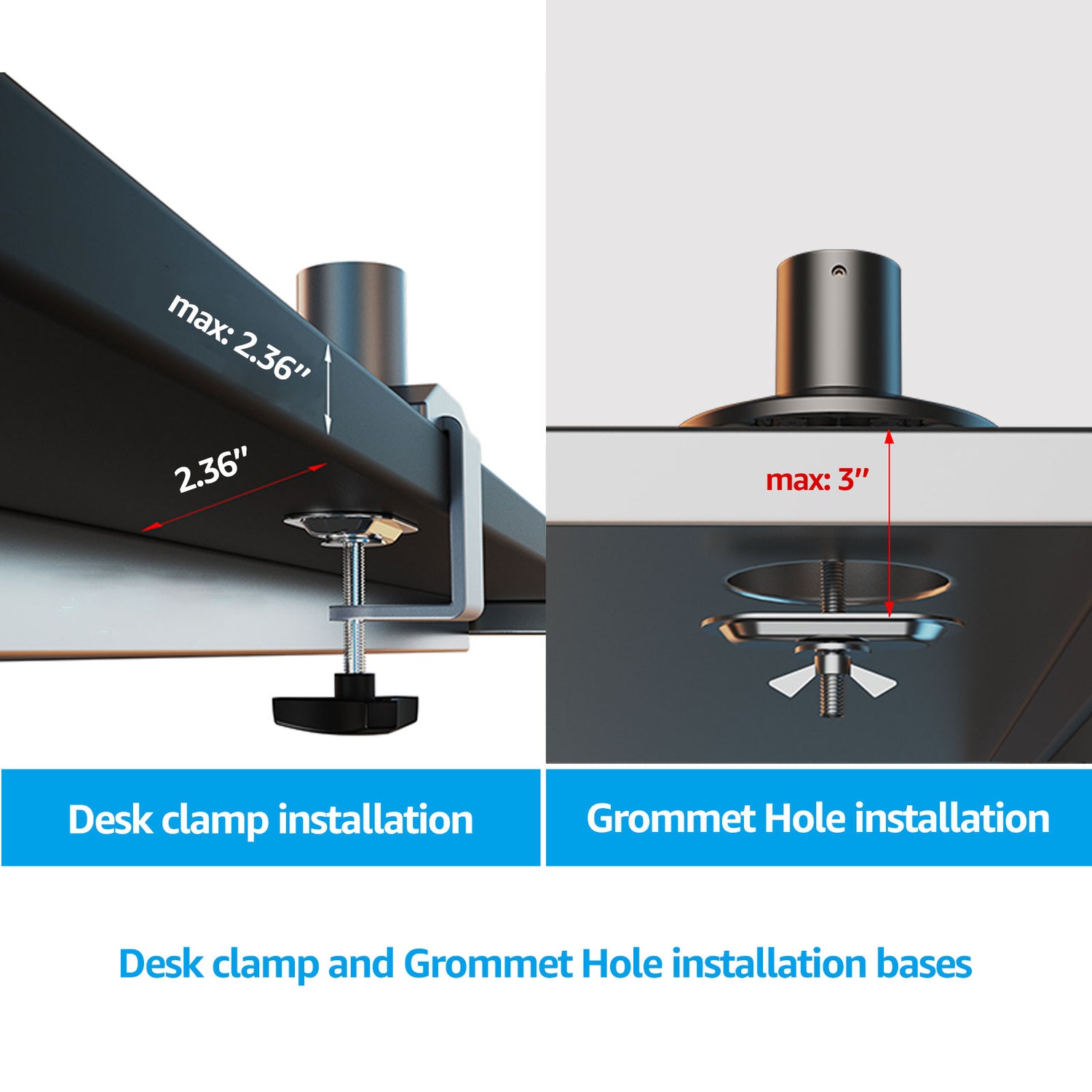 - 【Multiple Options】: The two-stage locking system is compatible with 2.36” C-clamp and 3” Grommet Base.Double efficiency and productivity by opening up desk space allowing you to work in a more comfortable and ergonomically correct position to reduce stress.