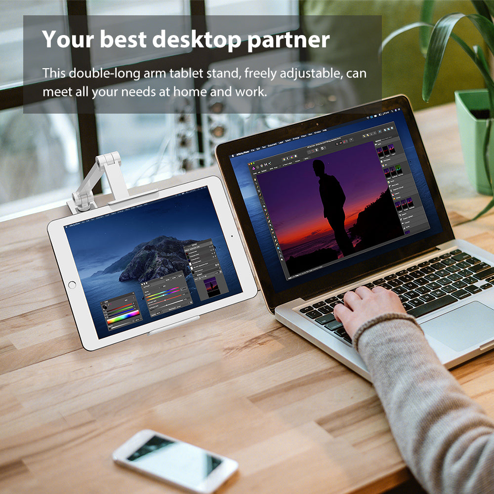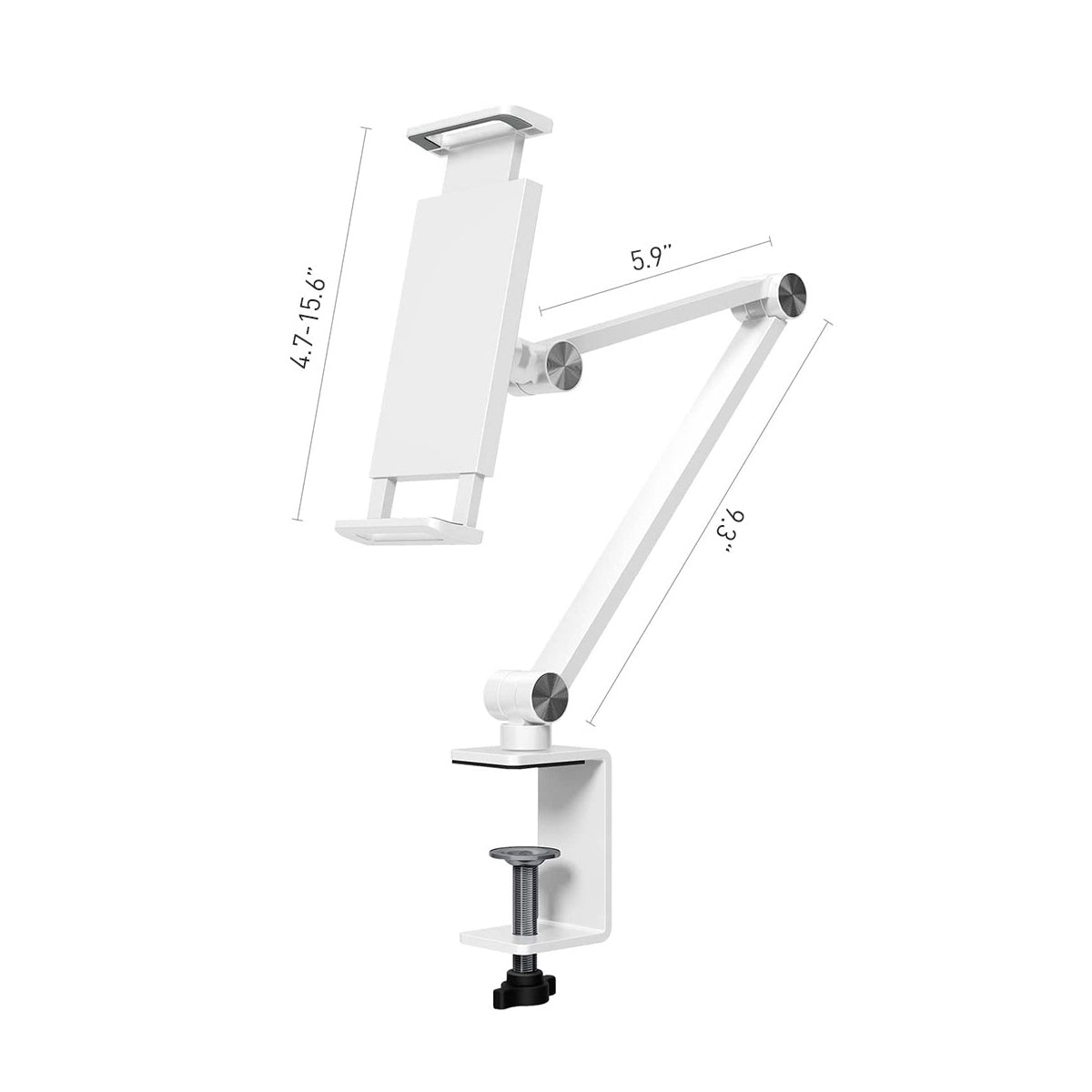 - 【Compatibility】: This aluminum tablet stand is compatible with 4.7-15.6 inch mobile phones and tablet devices, such as iPhone 11,Samsung Galaxy, iPad 1/2/3/4, surface, surface pro, iPad pro 12.9/9.7 and so on. Note: if using iPad pro and other heavy devices, it is necessary to adjust the side screws to increase the bearing force of the arm.