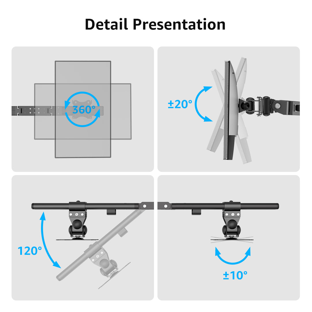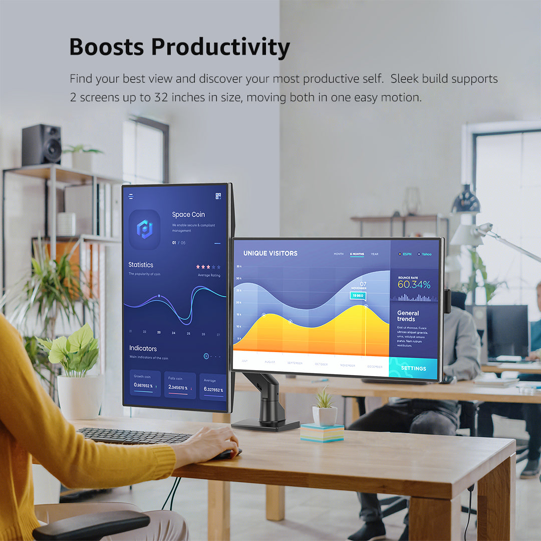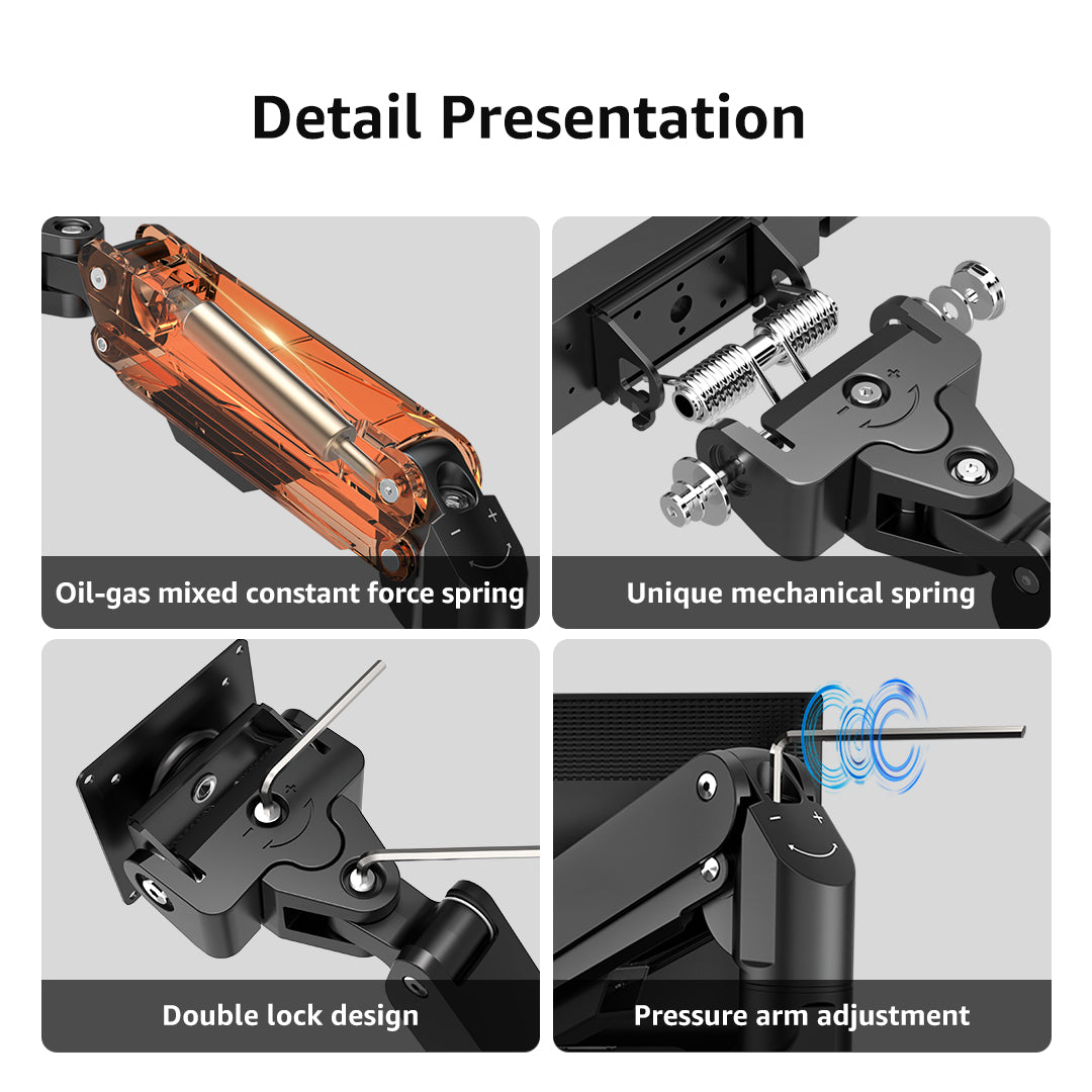- Monitor Arm Highlight Design:In the VESA head, we add two powerful mechanical springs,allows you to position 2 monitors side by side, creating a seamless viewing experience and expanding your screen real estate.